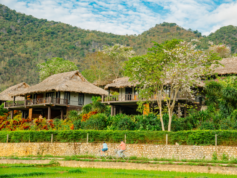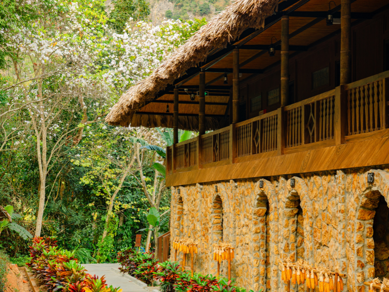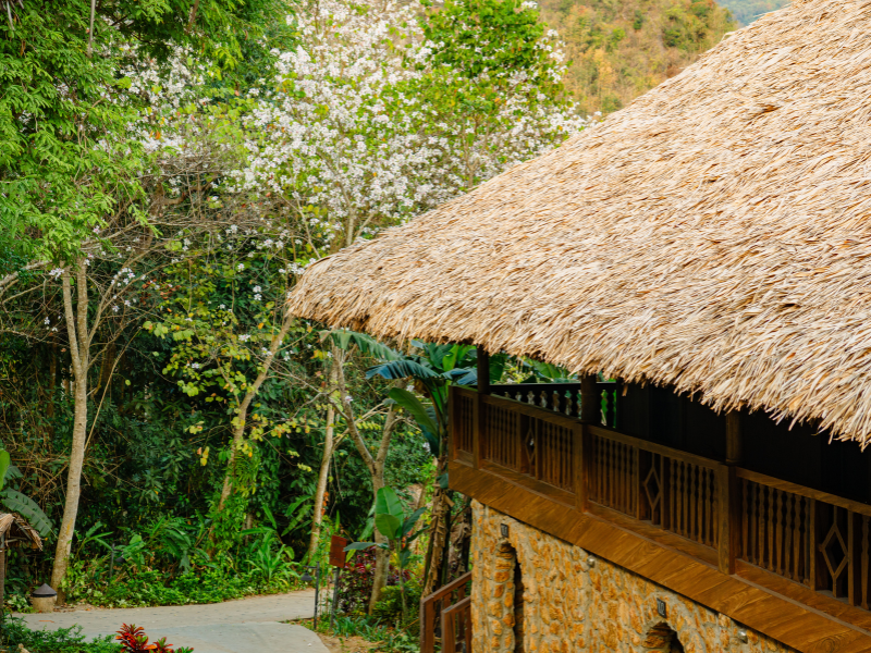 Located on a hillside overlooking the Mai Chau valley, the ecolodge is surrounded by rice fields and mountains. During ban blossom season, white flowers appear throughout the property – along walking paths, beside bungalow terraces, and on stone steps leading through the gardens.