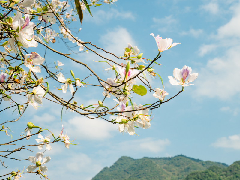 Every season in Mai Chau has its own charm, but March is often considered the most gentle and romantic time of the year. When ban blossoms bloom, the entire region seems to awaken after the quiet winter months. Small village roads, green hills, and wide valleys are all dotted with delicate white flowers.