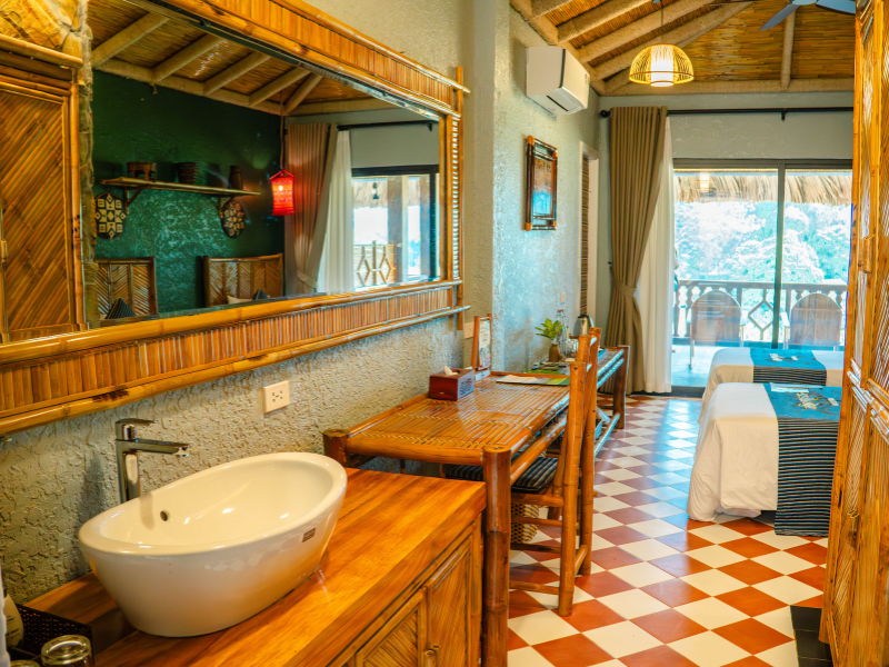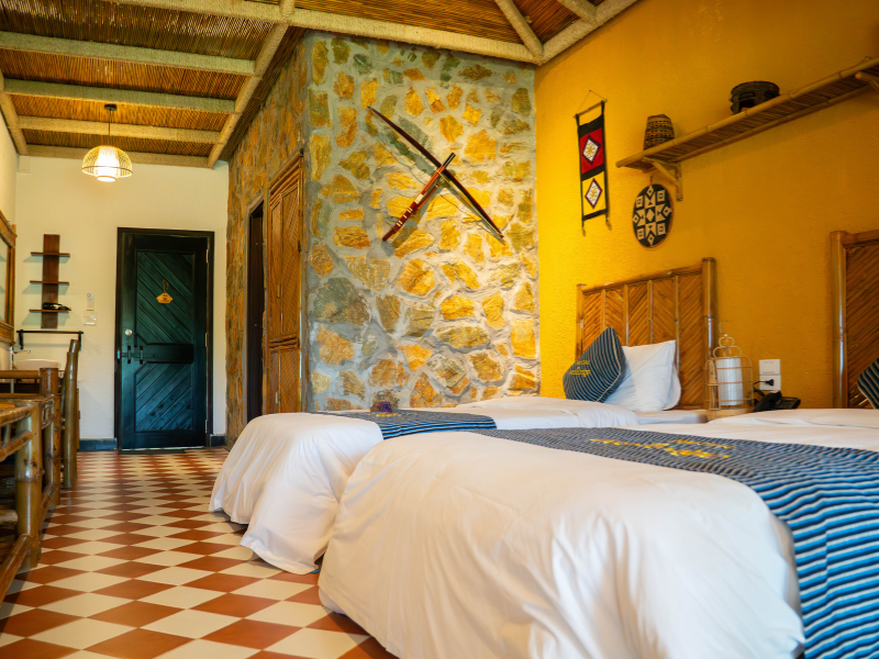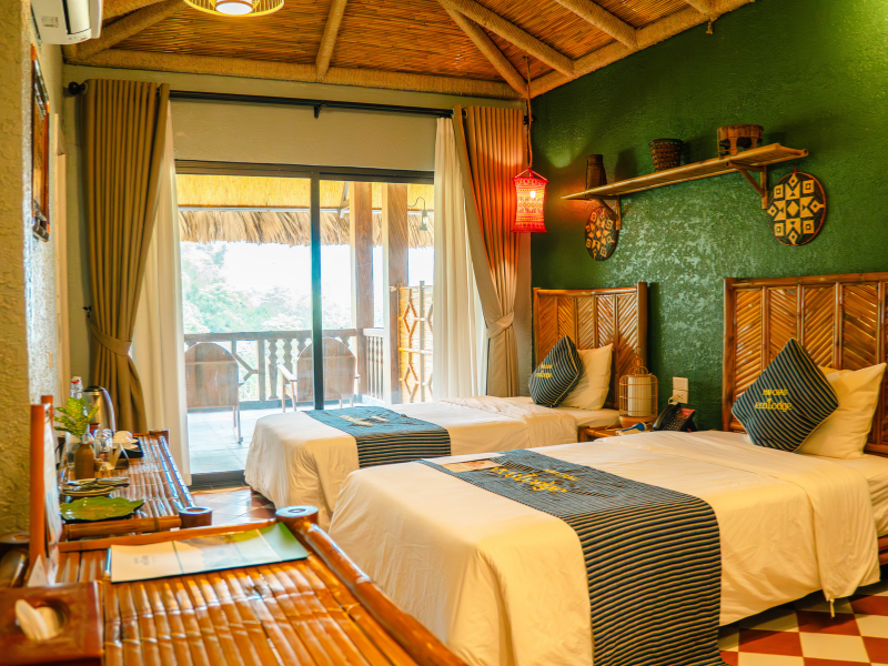 Phòng Superior không chỉ là nơi để nghỉ ngơi, mà còn là cách để bạn chạm vào nhịp sống của người Mai Châu. Từ khung cửa sổ, bạn có thể thấy những mái nhà sàn lẩn trong ruộng lúa, những người phụ nữ Thái phơi thổ cẩm trước hiên nhà, hay tiếng cười nói vang lên giữa buổi chiều muộn.