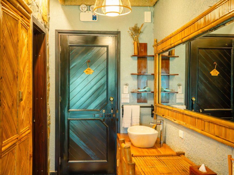 Phòng Superior được thiết kế theo phong cách nhà sàn người Thái, với tường đá, mái lá, họa tiết thổ cẩm và nhiều chi tiết làm bằng tre tự nhiên. Mỗi căn phòng đều có ban công rộng, nơi bạn có thể ngồi ngắm nhìn thung lũng xanh, dãy núi trập trùng phía xa hay ánh hoàng hôn phủ xuống ruộng lúa. Không gian bên trong ấm cúng, ánh sáng nhẹ, màu gỗ và mây hòa cùng hương núi. Dãy tầng 1 có cánh cửa mở độc đáo, mà chúng tôi vẫn gọi vui là “cánh cửa thần kỳ trong truyện cổ Grimm” – bởi chỉ cần bước qua, bạn sẽ thấy một không gian khác hẳn: yên tĩnh, thân thuộc, và có chút gì đó như trong chuyện xưa giữa núi rừng.